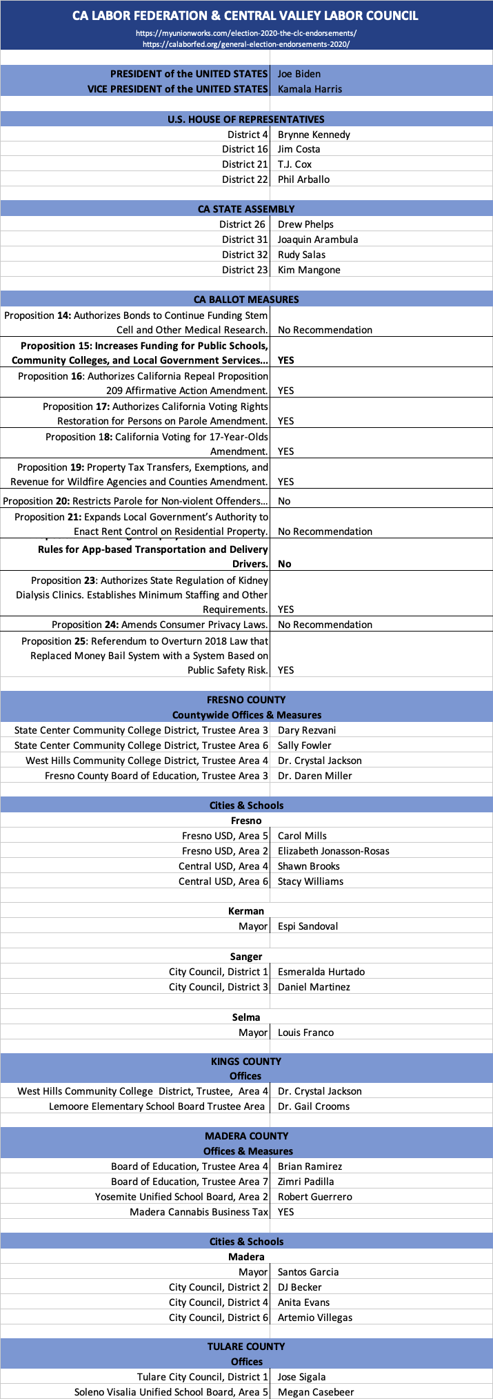 Central Valley Labor Council Endorsements