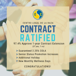 We are pleased to let you know that the 2021-2022 Centro Legal de la Raza contract extension agreement has been signed and is fully in effect. You can find the signed agreement in the sidebar on the ESC Centro page, or by following this link. Congratulations to all on this incredible victory!