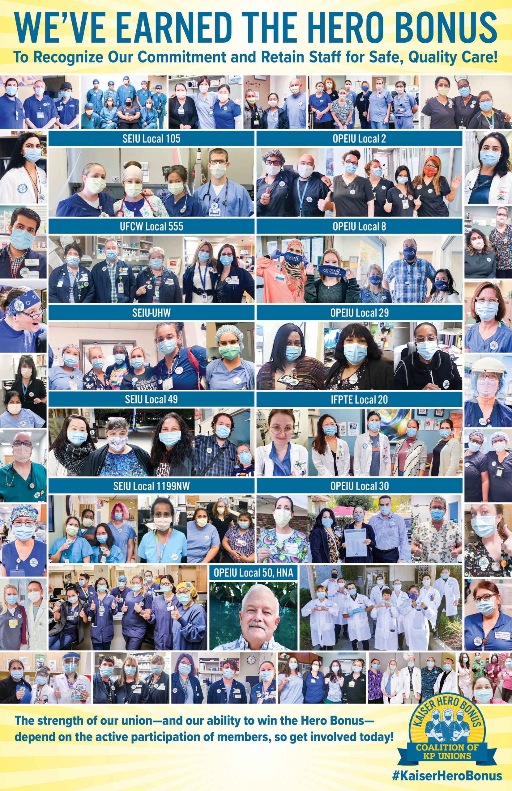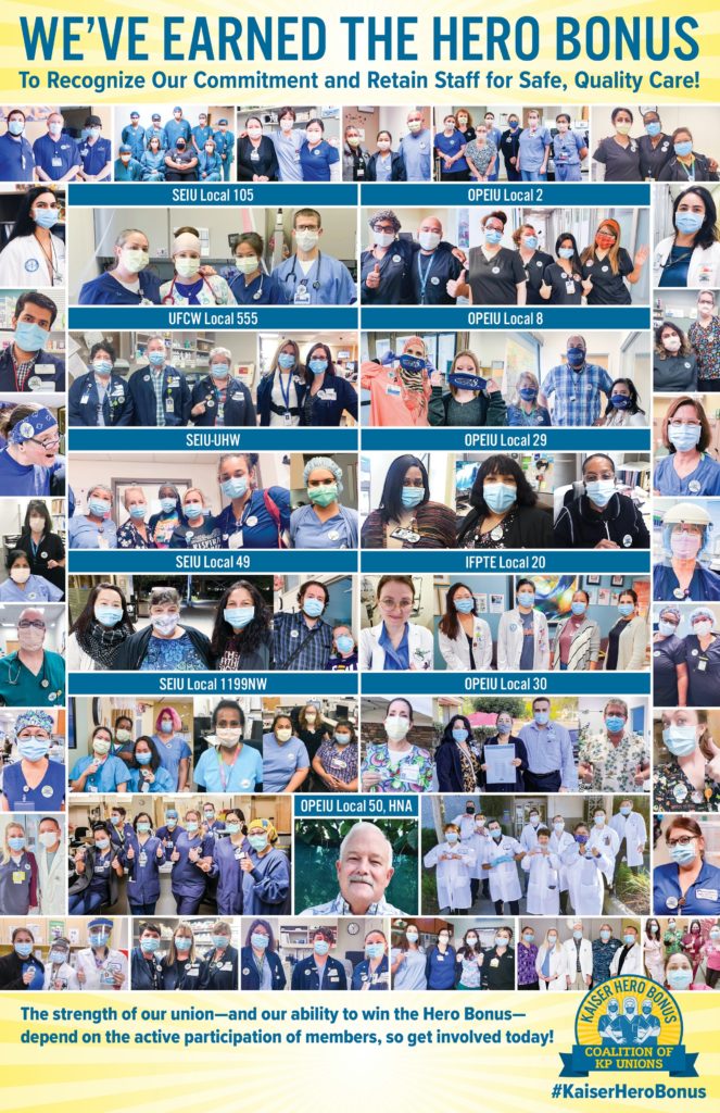 In the last few weeks, thousands of frontline Kaiser healthcare workers across the country have been proudly wearing our buttons to let executives know, “We’ve Earned the Kaiser Hero Bonus!” This week, we ask you to join us as we honor the sacrifices that Kaiser Heroes and our families have endured and continue our call for Kaiser executives to give back to frontline staff.