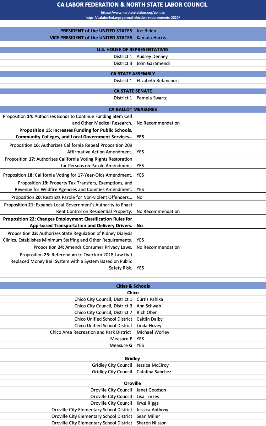 Below are the election recommendations from the California Labor Federation and the Central Labor Council by area: