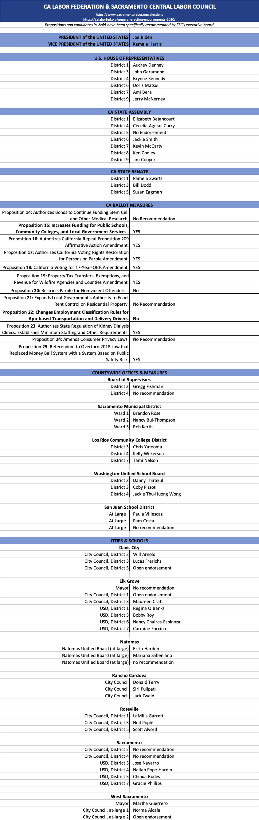Sacramento Labor Council Endorsements